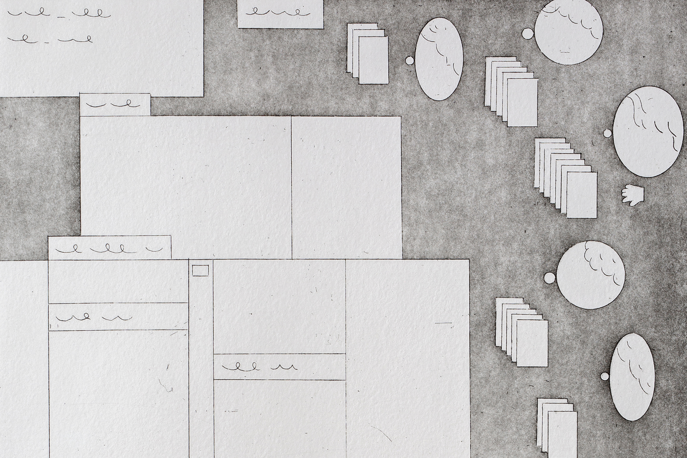 | 1 | «Le rêve du téléphone» & «Signatures» — 56 x 76 cm. Gouache sur papier Arches | 2 | Détail | 3 | «The PPT» & «La grotte aux tickets» — 56 x 76 cm. Gouache sur papier Arches | 4 | Détail. 2019 ¶ | 1 | «Le rêve du téléphone» & «Signatures» — 56 x 76 cm. Gouache on Arches paper | 2 | Closer view | 3 | «The PPT» & «La grotte aux tickets» — 56 x 76 cm. Gouache on Arches paper | 4 | Closer view. 2019 -