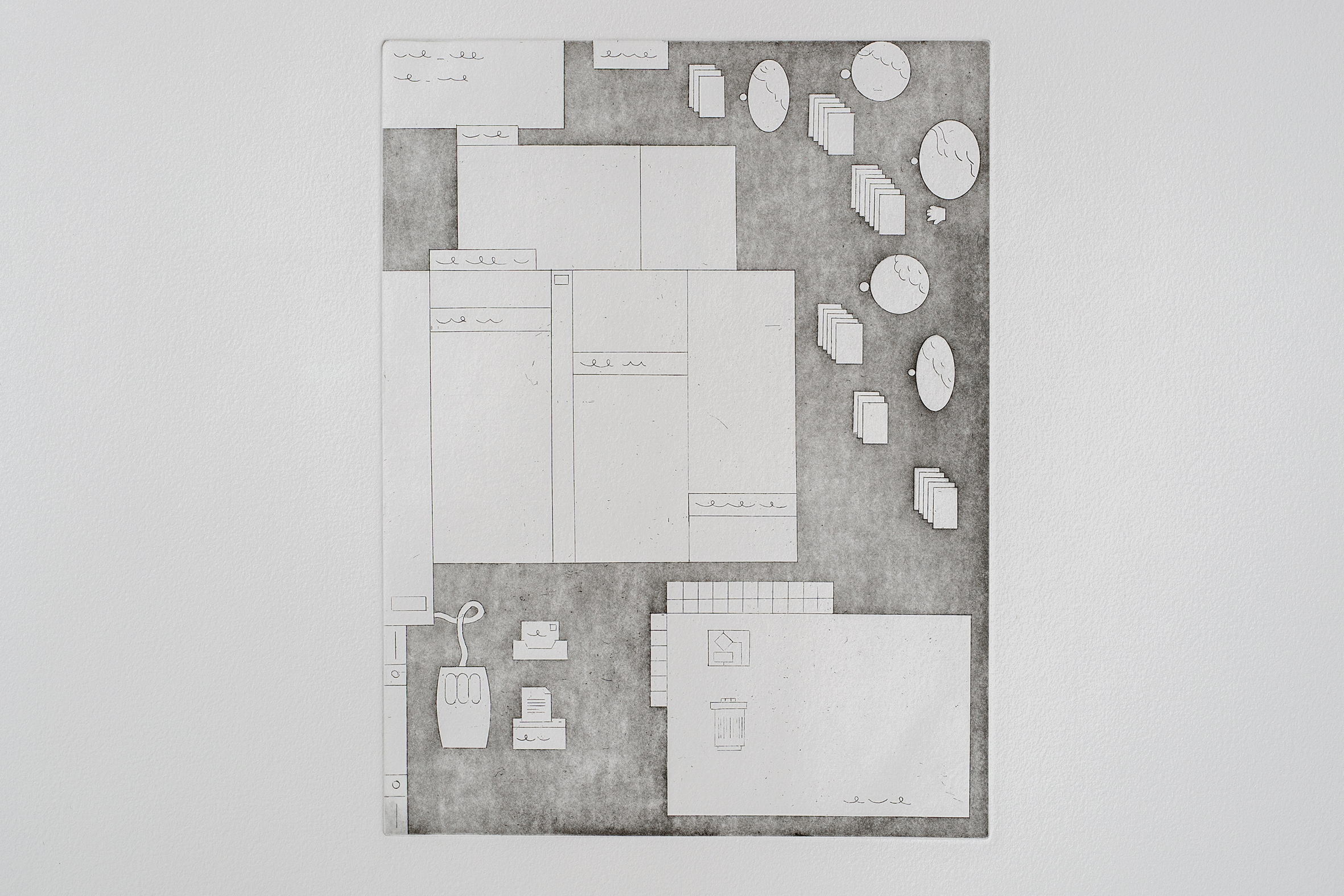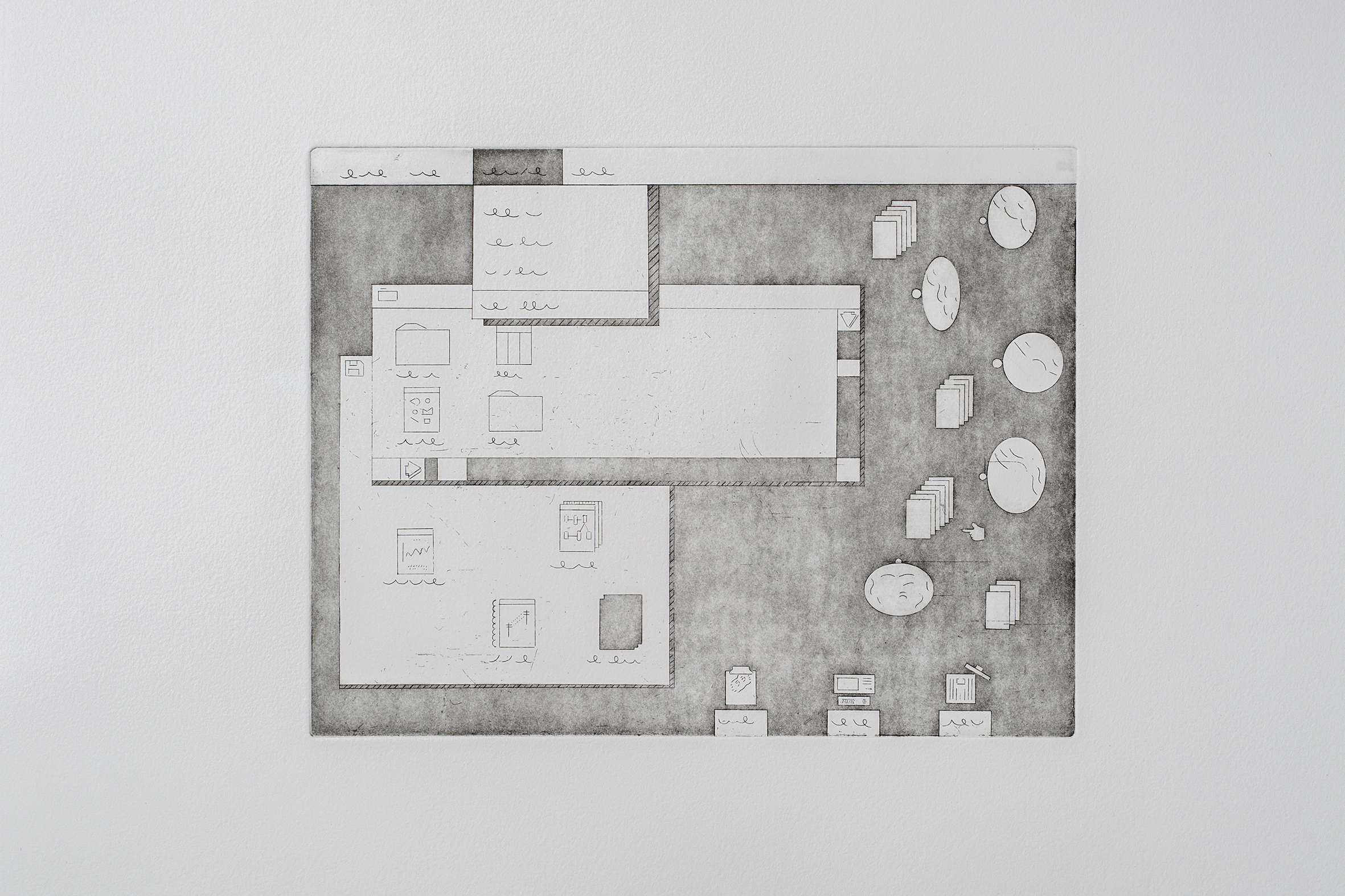 | 1 | «Paresse» – 13 x 17,5 cm. Gravure eau-forte sur papier et crayon de couleur. Signé et numéroté | 2 | «Querelle des universaux (summer remix)» – 17,8 x 23,5 cm. Gravure eau-forte sur papier. Signé et numéroté | 3 | «Derrière le rideau» – 17,8 x 23,5 cm. Gravure eau-forte sur papier. Signé et numéroté | 4 | «Les graffiti» – 21,9 x 29,1 cm. Gravure eau-forte sur papier et crayon de couleur. Signé et numéroté | 5 | «Le reflet» – 19,5 x 19,5 cm. Gravure eau-forte sur papier. Signé et numéroté. 2014 ¶ | 1 | «Paresse» – 13 x 17,5 cm. Etching on paper and color pencil. Signed and numbered | 2 | «Querelle des universaux (summer remix)» – 17,8 x 23,5 cm. Etching on paper. Signed and numbered | 3 | «Derrière le rideau» – 17,8 x 23,5 cm. Etching on paper. Signed and numbered | 4 | «Les graffiti» – 21,9 x 29,1 cm. Etching on paper and color pencil. Signed and numbered | 5 | «Le reflet» – 19,5 x 19,5 cm. Etching on paper. Signed and numbered. 2014 -