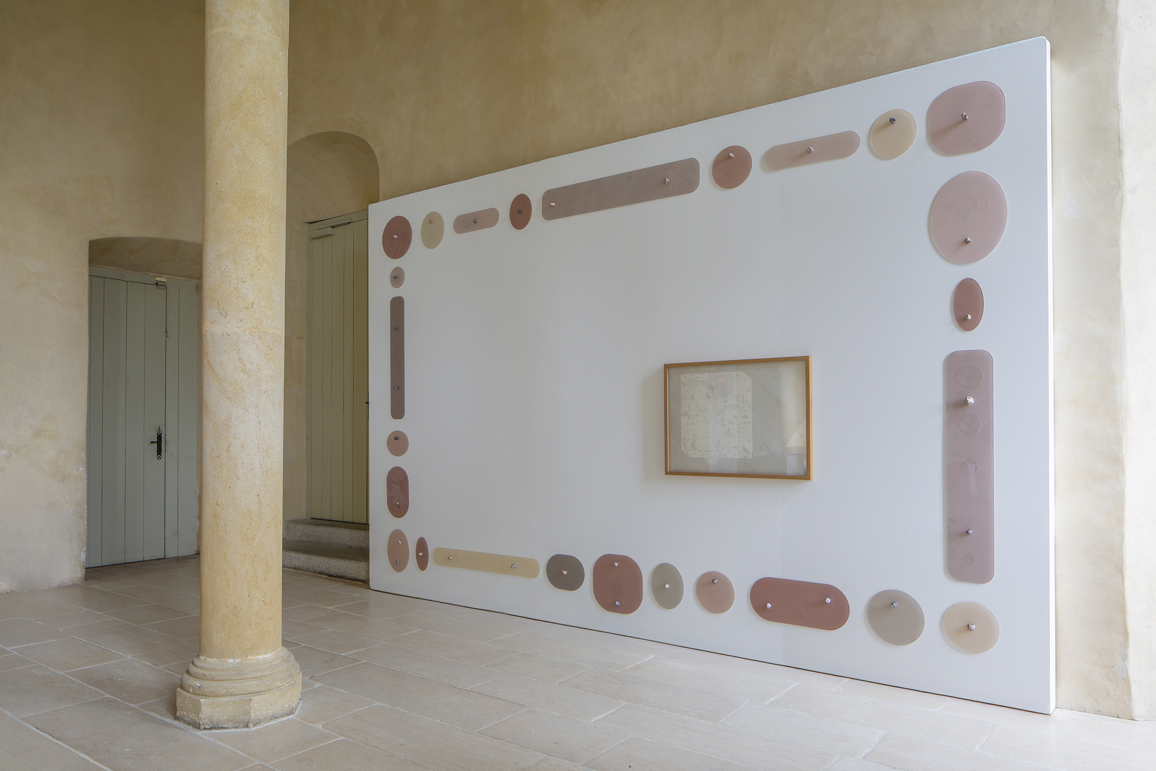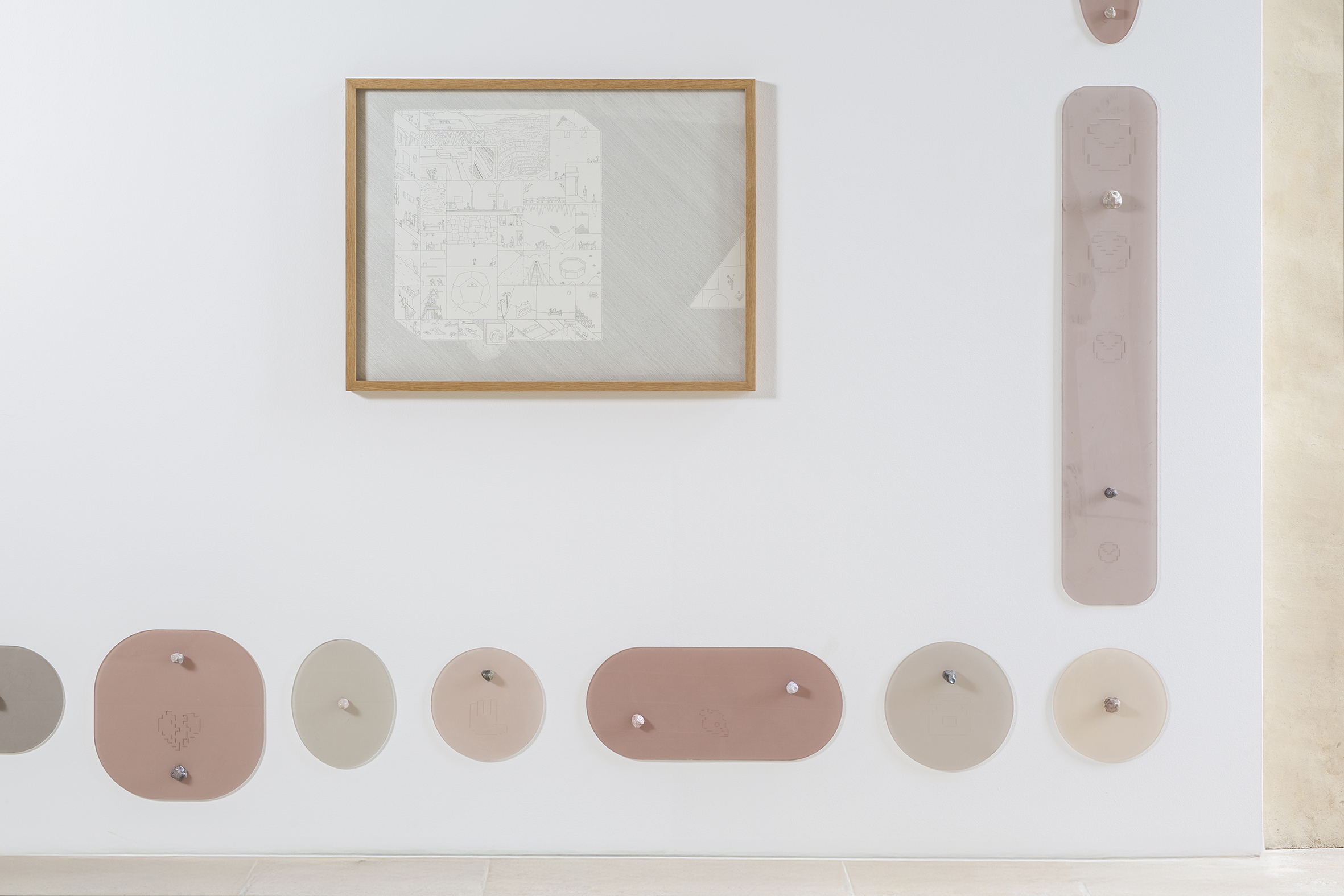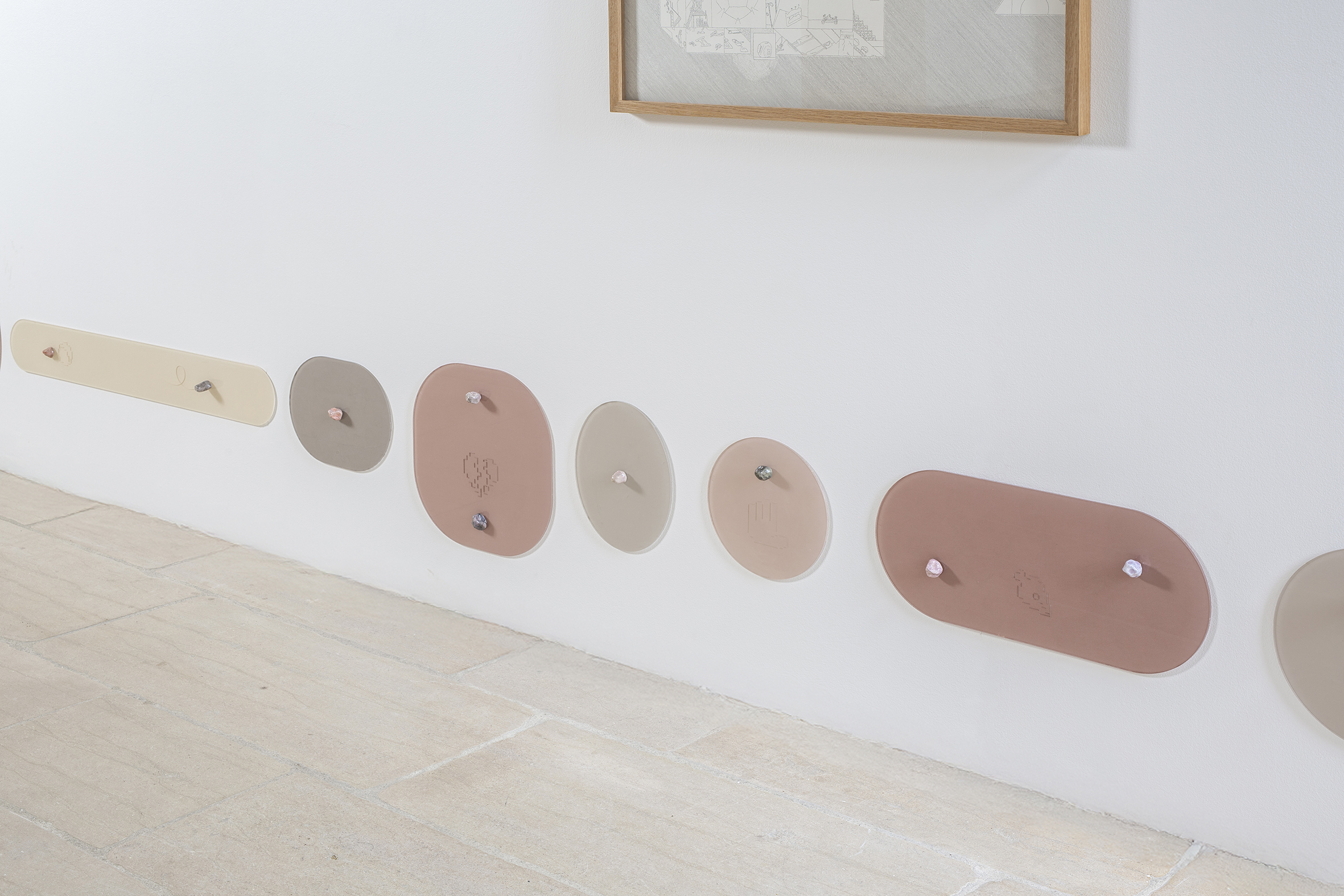 | 1 | «Idiome lisse» — 200 x 250 cm. Feuilles de PMMA, peinture vinylique et caséine, céramique émaillée, visses | 2 > 7 | Détails. 2023 ¶ | 1 | «Idiome lisse» — 200 x 250 cm. PMMA sheets, vinyl and casein paint, enameled ceramic, screws | 2 > 7 | Closer view. 2023 -