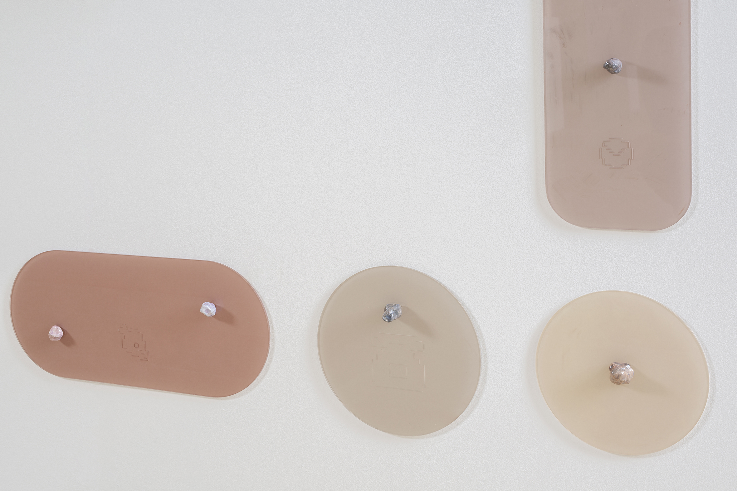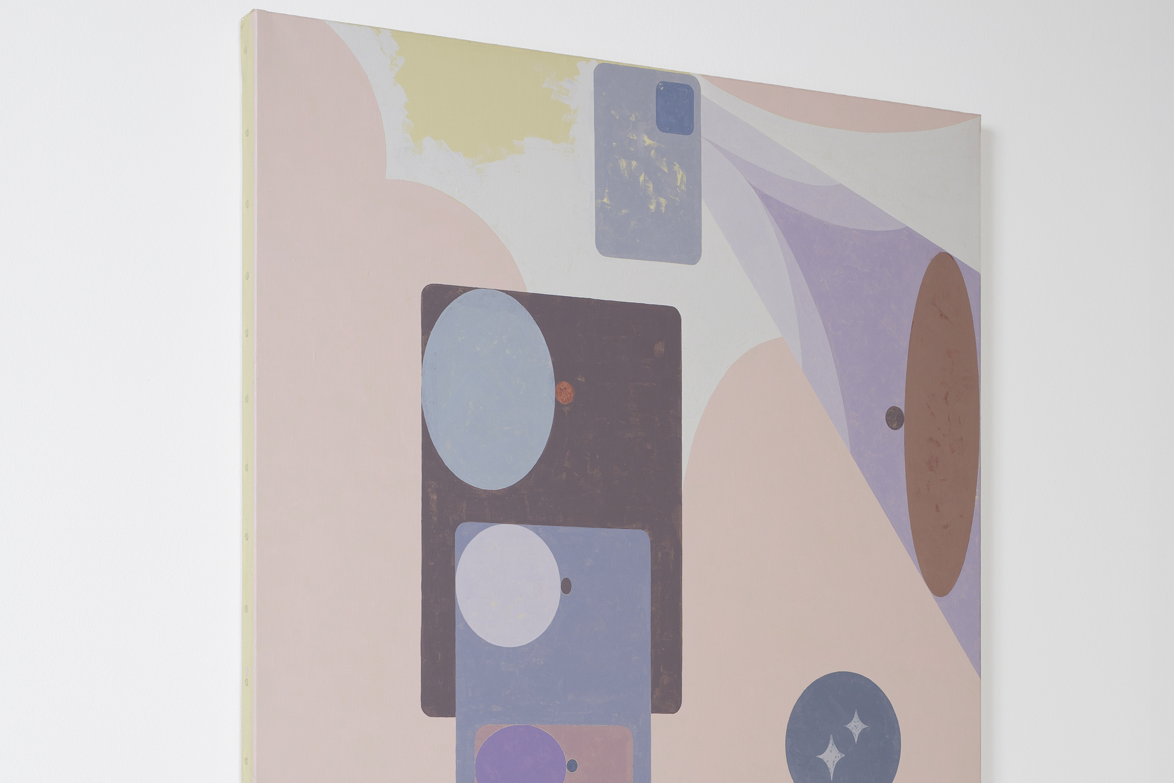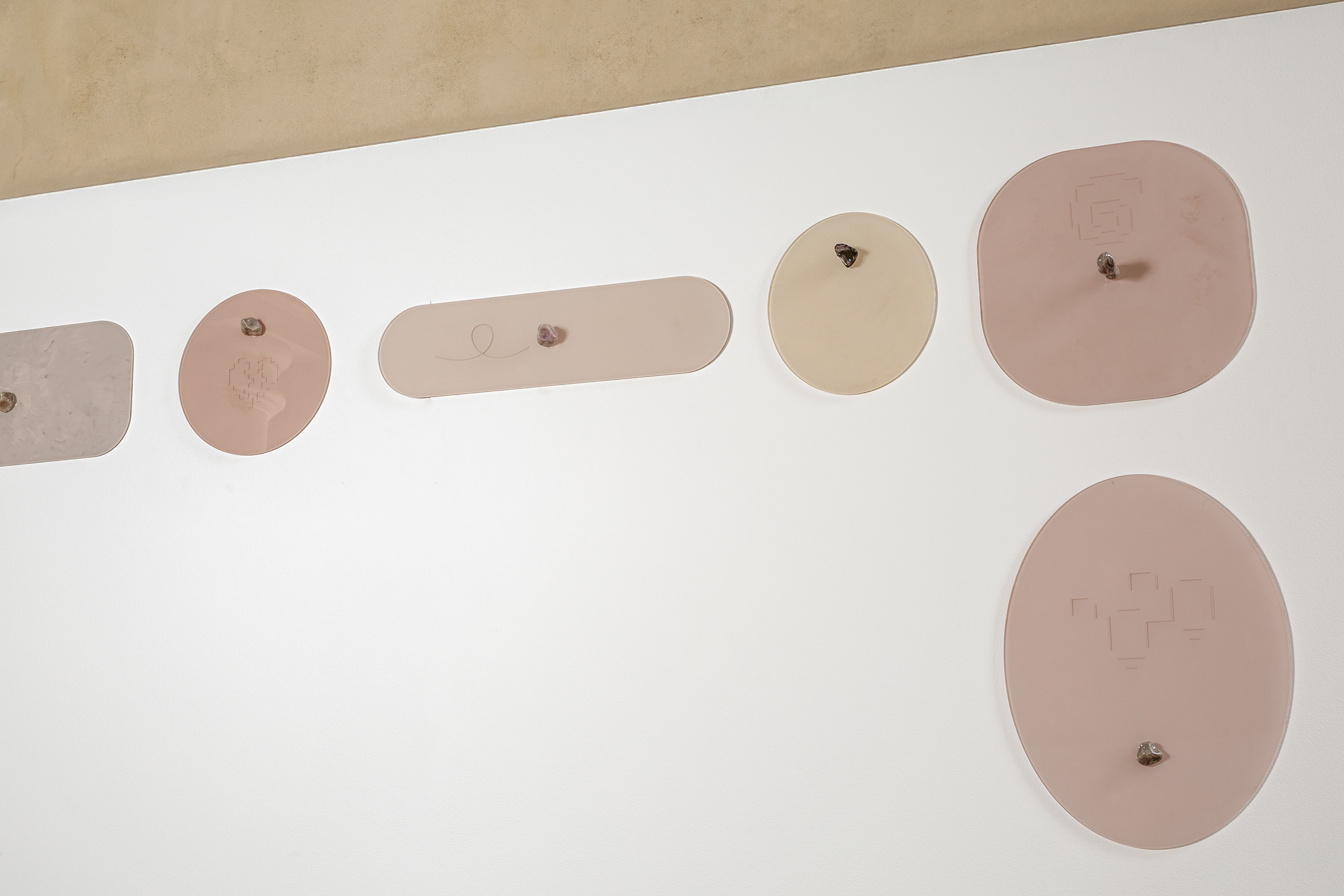 | 1 | «Idiome lisse» — 200 x 250 cm. Feuilles de PMMA, peinture vinylique et caséine, céramique émaillée, visses | 2 > 7 | Détails. 2023 ¶ | 1 | «Idiome lisse» — 200 x 250 cm. PMMA sheets, vinyl and casein paint, enameled ceramic, screws | 2 > 7 | Closer view. 2023 -